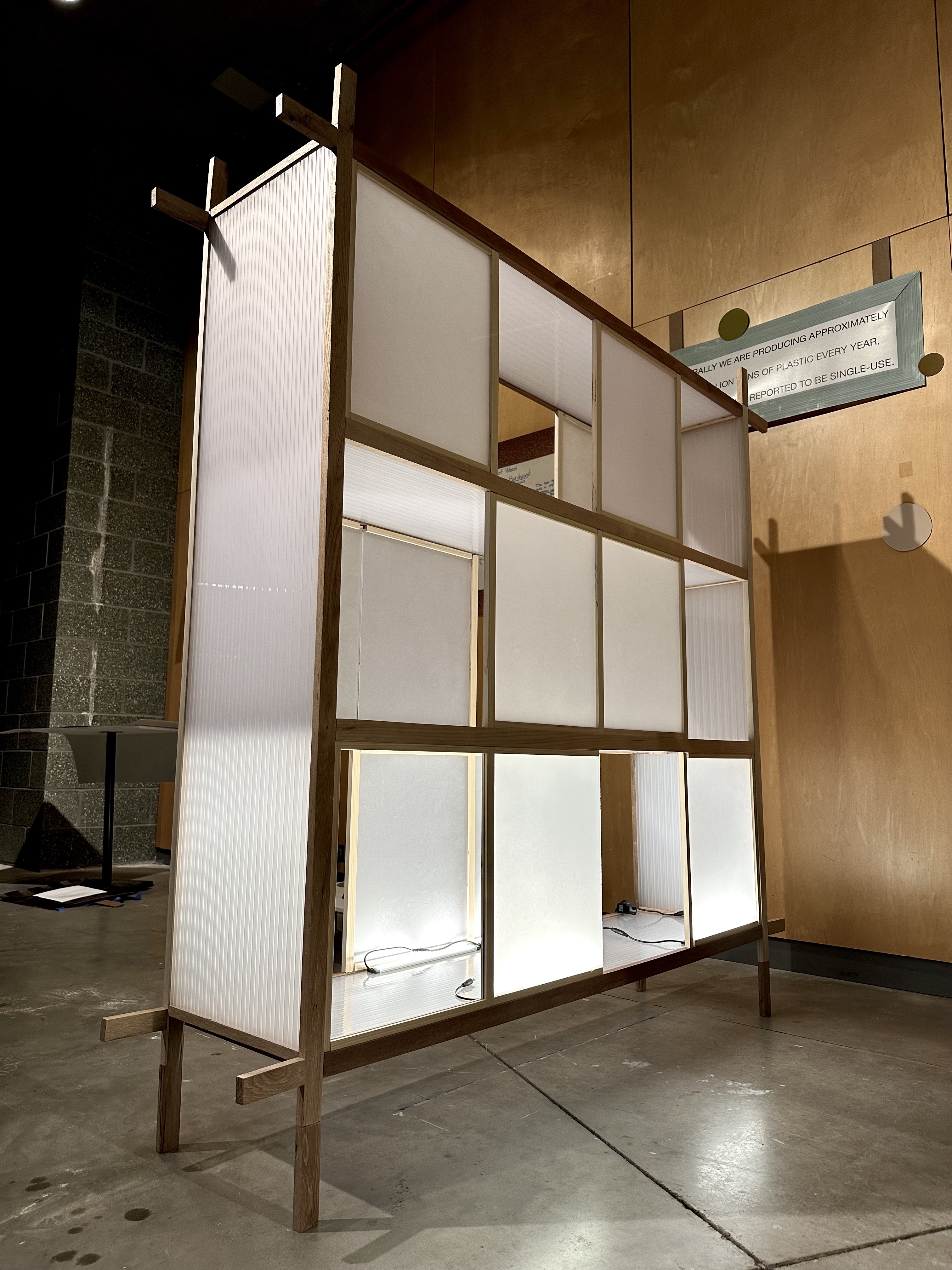Inspired by the sculptural 'Space Frames' lamps by Studio Mieke Meijer, the shelf's minimalist form and material usage shaped its design foundation. The use of thin frames became central, allowing for the efficient use of wood scraps collected from various studios' past projects. Gaps were filled with plastic panels salvaged from the Baltimore community, giving new life to discarded materials. The O/C Accent Shelf embodies efficient, sustainable, and playful design.